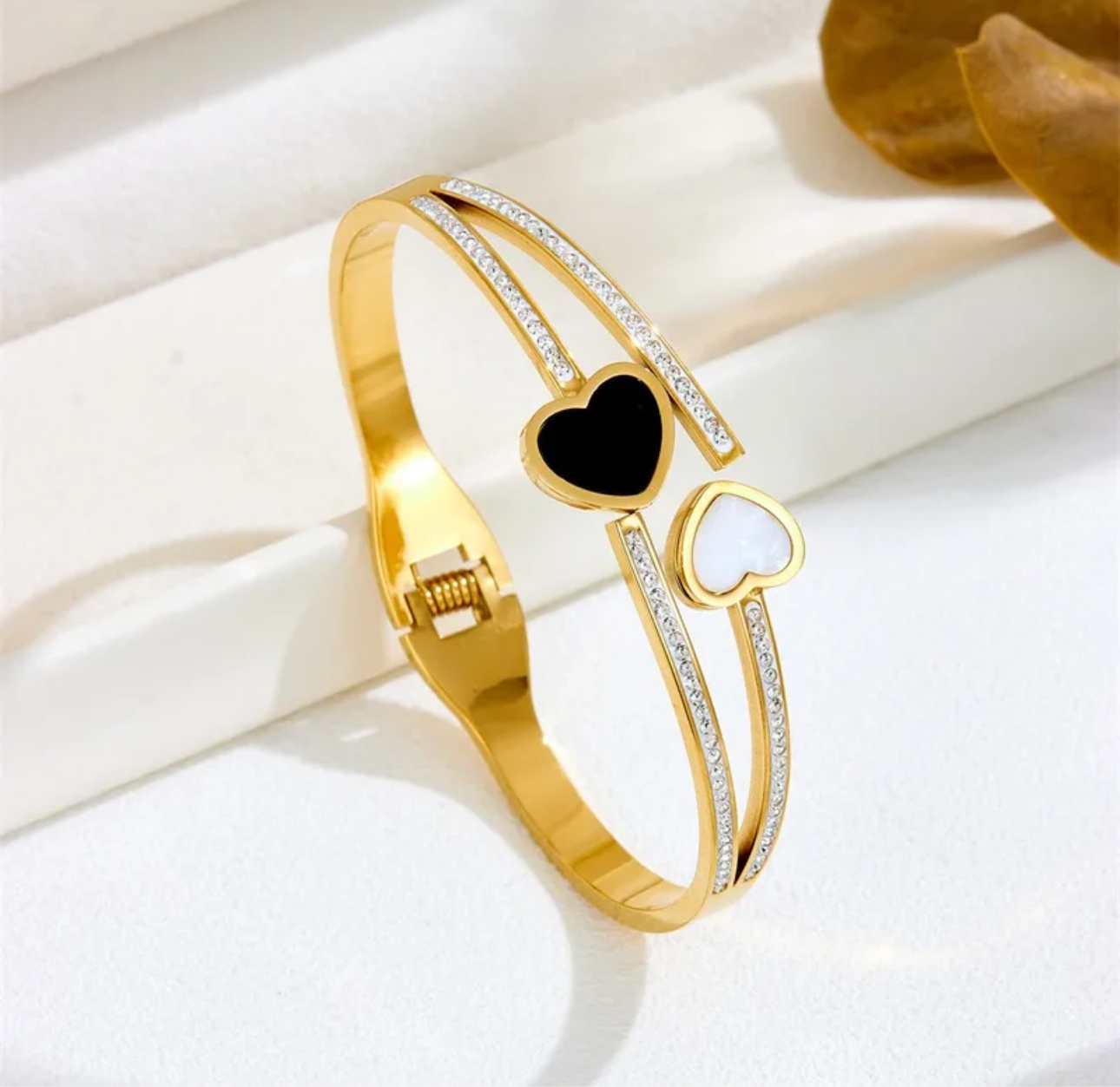 Pulsera en dorado con doble corazón en negro y blanco, acentuada con cristales brillantes. Elegante, femenina y perfecta para llevar el amor contigo siempre.