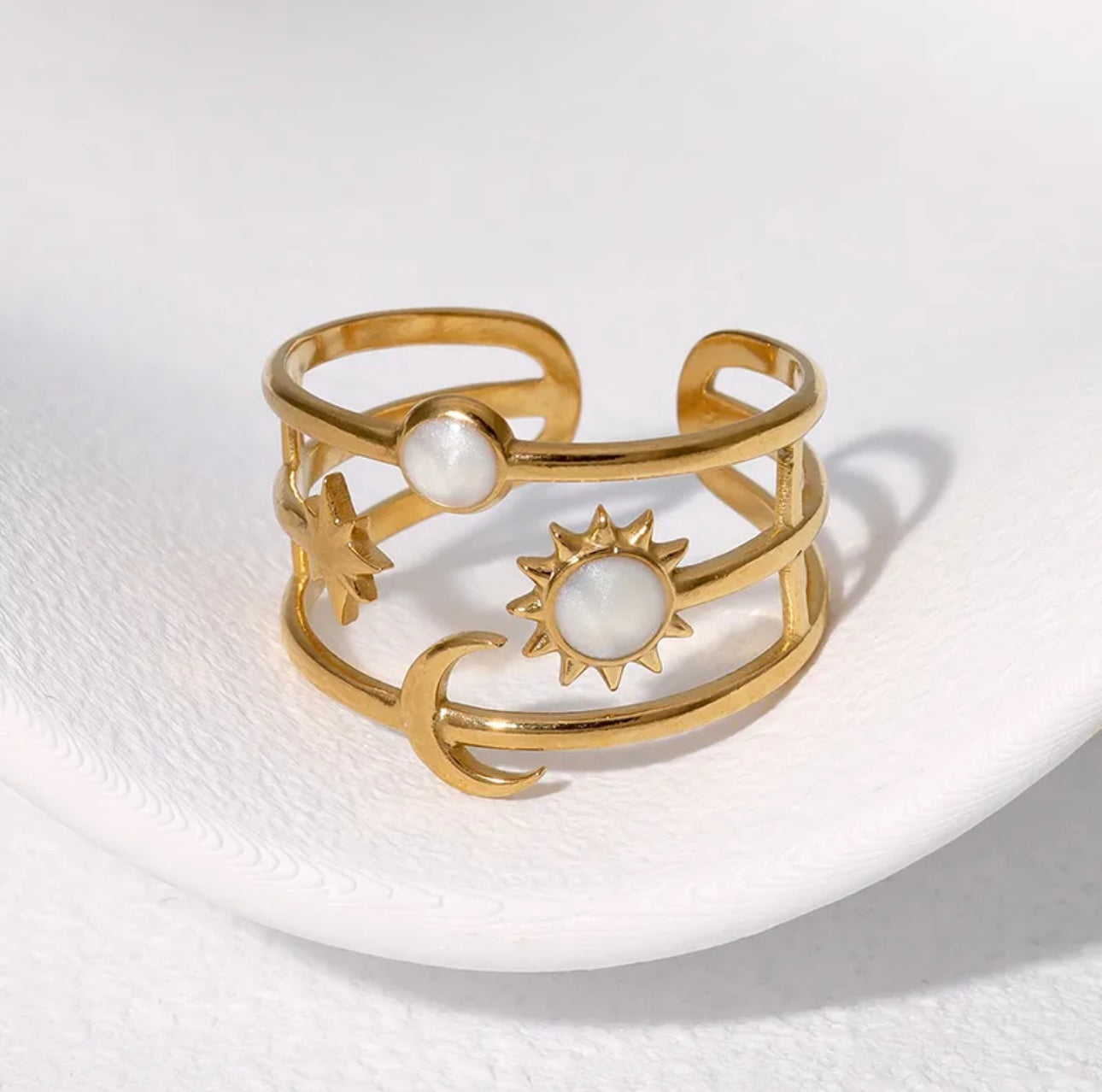 Sortija en acero inoxidable con símbolos de sol, luna y estrella grabados, que aporta un toque celestial y elegante a tu estilo.