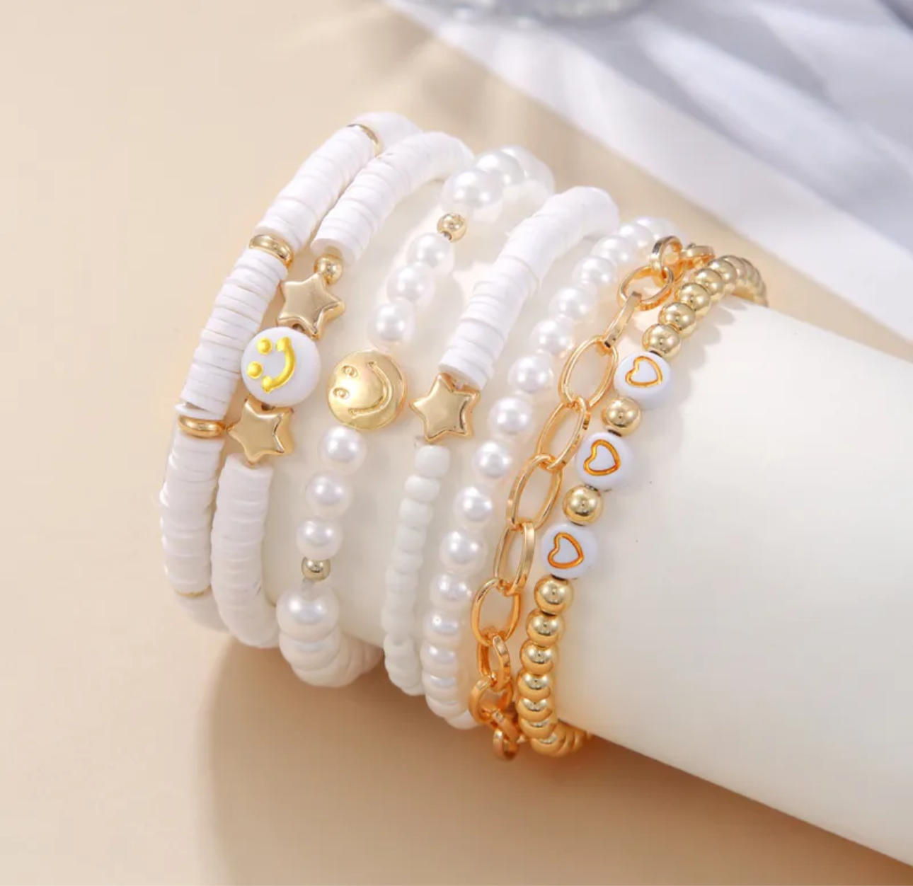 Un set de pulseras que combina elegancia y diversión. Con perlas blancas, cuentas doradas y detalles de estrellas, caritas sonrientes y corazones, estas pulseras aportan un toque luminoso y alegre a cualquier look. Perfectas para usar solas o en conjunto, reflejando tu estilo único y positivo cada día